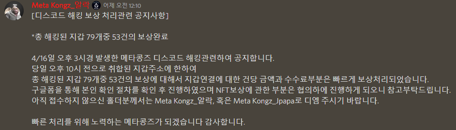 결론부터 말씀드리면, 4월 16일 오후 3시쯤, 메타콩즈 디스코드 관리자 계정에 해킹이 발생했습니다.