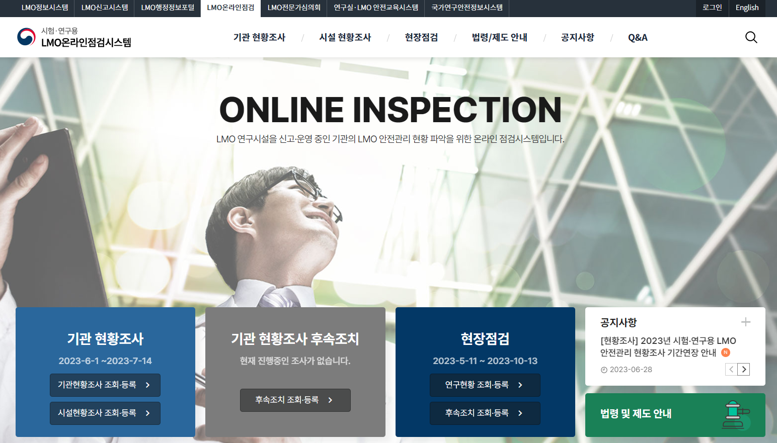 2023년도에는 6월 1일부터 6월 30일까지 LMO 온라인점검시스템을 통해 조사에 응할 수 있었습니다.