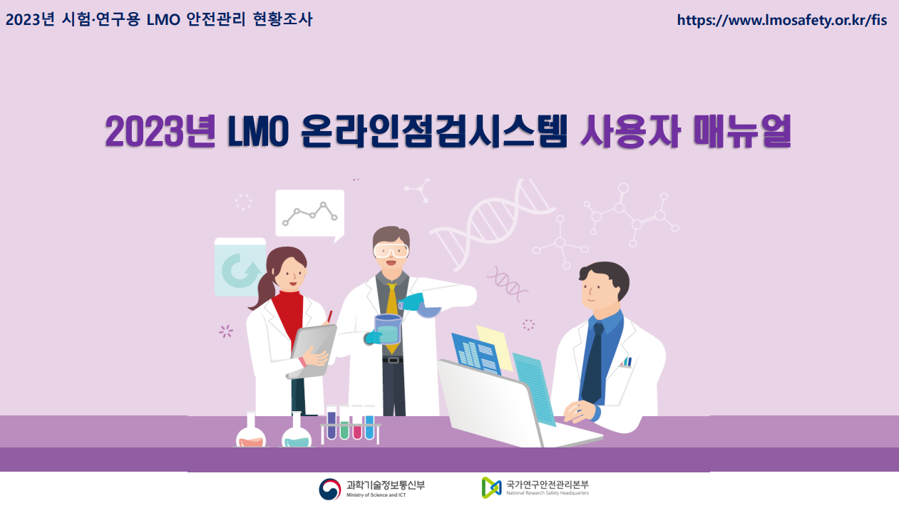 과학기술정보통신부에서는 시험연구용 LMO 취급 기관과 시설을 대상으로 LMO 연구현황 및 안전관리 실태를 파악하기 위해 "시험연구용 LMO 안전관리 현황조사"를 실시하고 있습니다😎