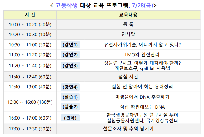 청소년들에게 "최신 생명공학 분야"를 쉽게 전달하고, 또 '유전자변형생물체(LMO)의 중요성'에 대해 교육하는 것이 목적입니다. 세부 교육내용은 다음과 같습니다.
