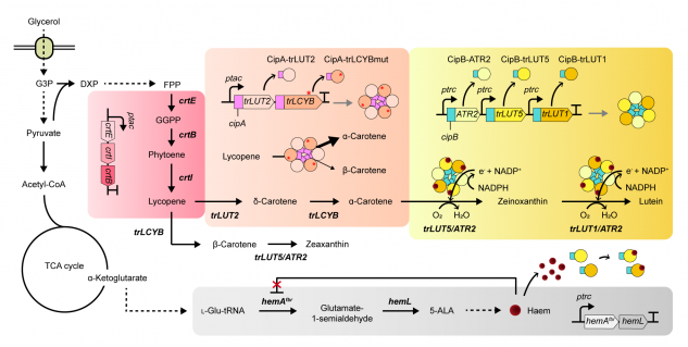 카이스트팀은 대장균 내 루테인 생산 대사회로를 구축했으며, 글리세롤을 탄소원으로 사용해 루테인 생산 대장균 균주를 만들 수 있다고 합니다.
