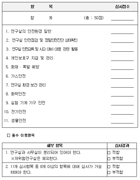 ※심사 분야 종류: 연구실 안전환경 시스템분야, 연구실 안전환경 활동 수준분야, 연구실 안전관리 관계자 안전의식 분야